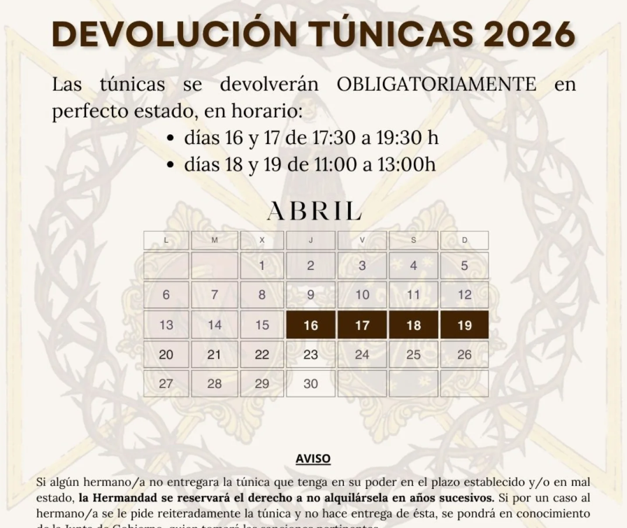 Recordamos a todos los hermanos/as que la devolución de túnicas es obligatoria y deberá realizarse en perfecto estado en las siguientes fechas: 🗓 16 y 17 de abril⏰ De 17:30 a 19:30 h 🗓 18 y 19 de abril⏰ De 11:00 a 13:00 h ⚠️ Importante:El incumplimiento de la entrega en plazo o en condiciones […]